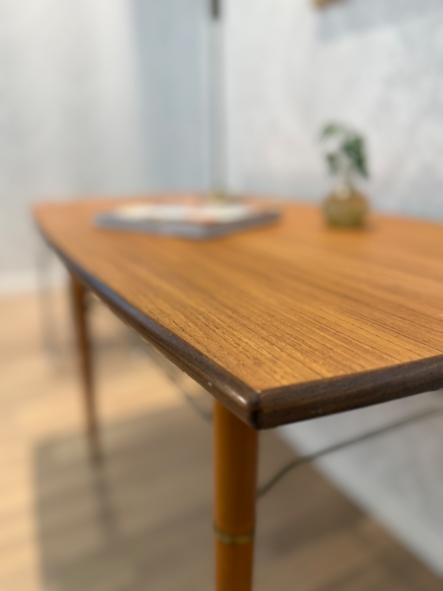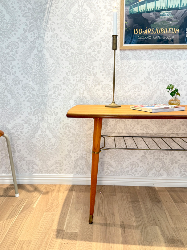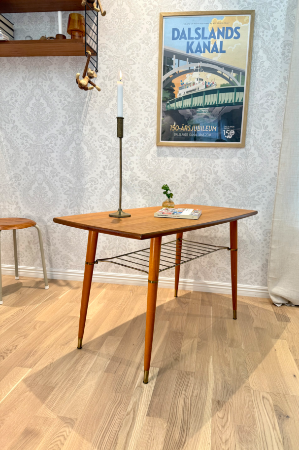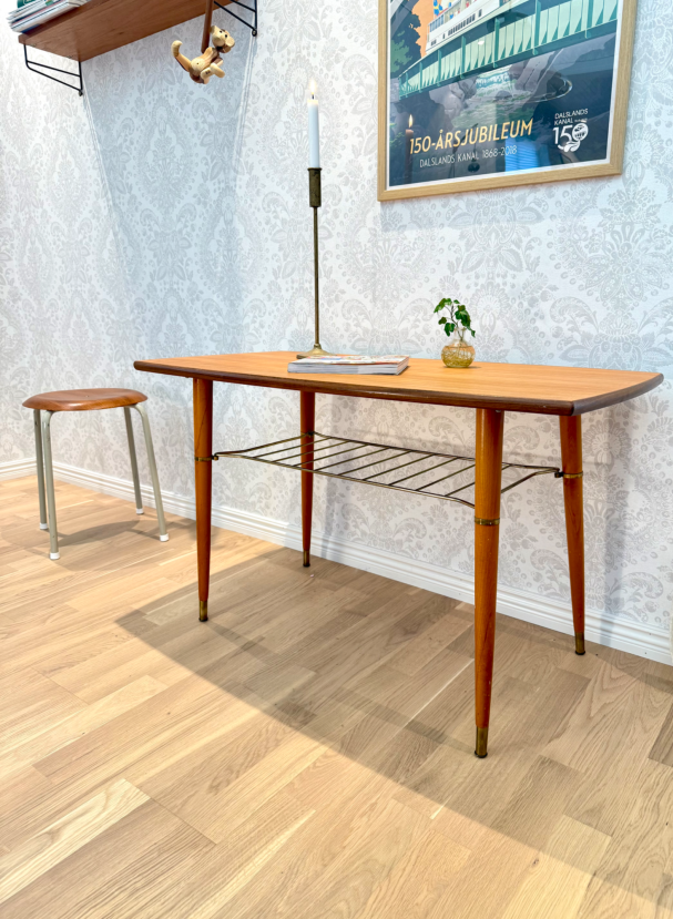 Nätt soffbord i teak med tidningshylla i mässing under. fin inramning med de mörka trät.