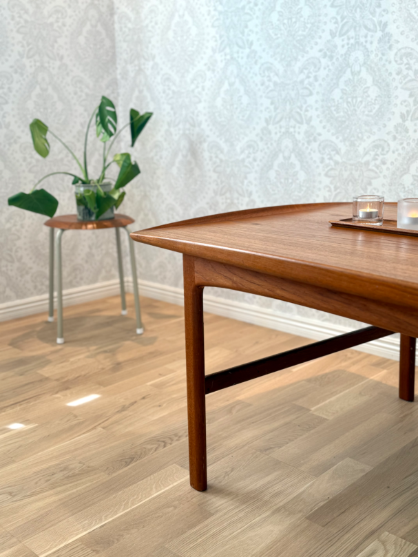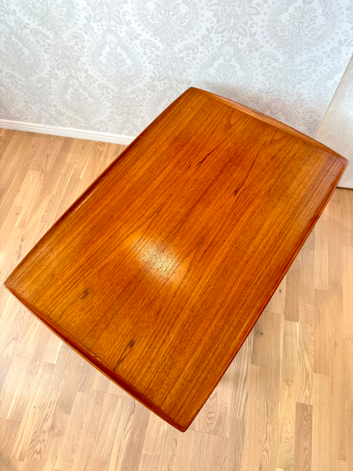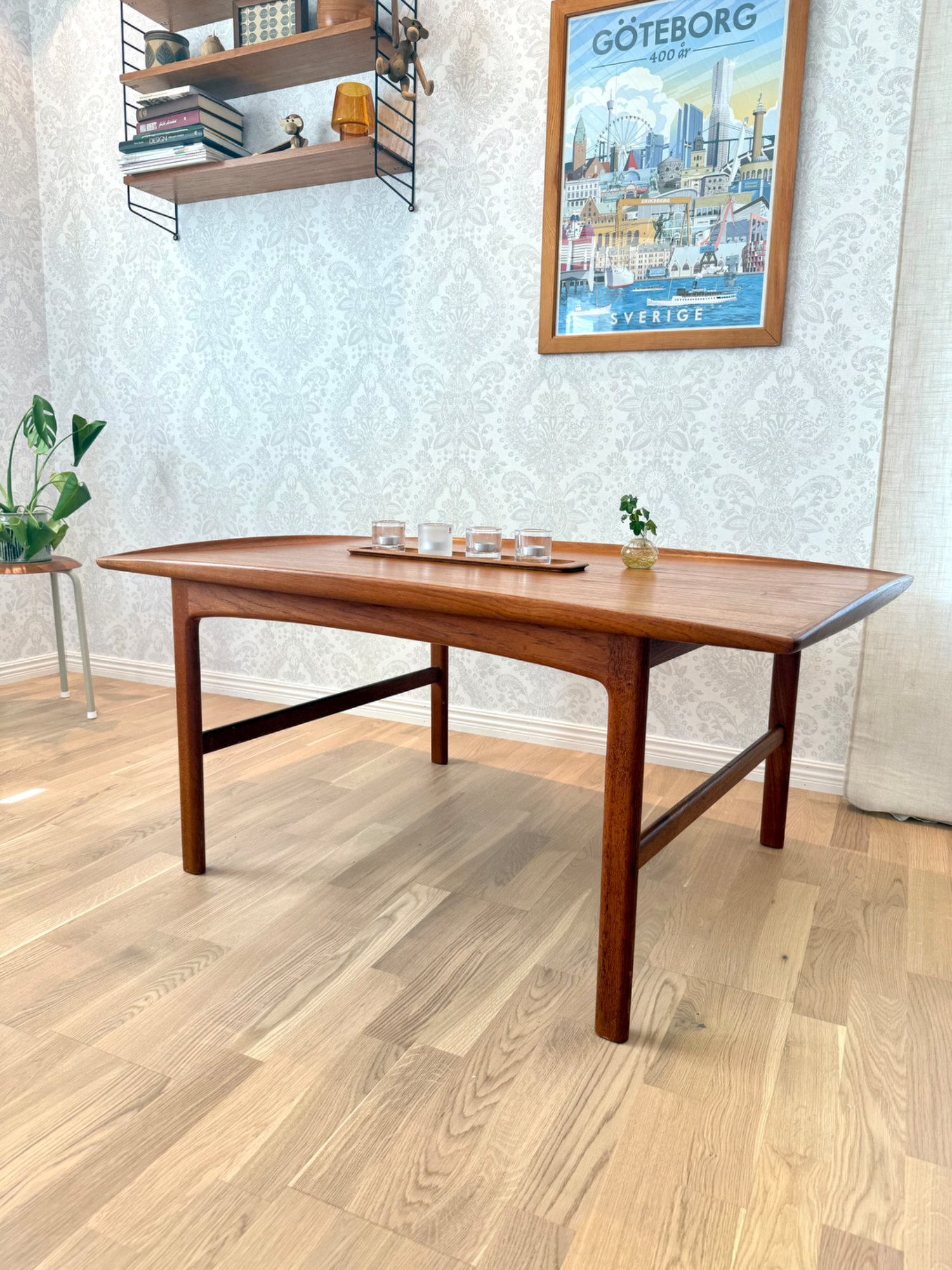 Teak soffbord med mjuka former, fin detalj med kanten som ramar in soffbordet.