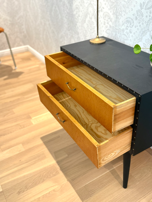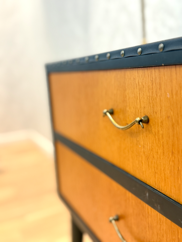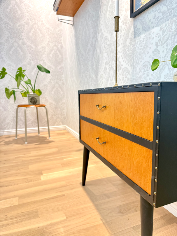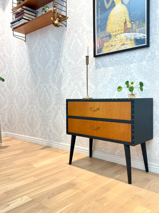 Teak byrå orgnial med svarta detaljer.