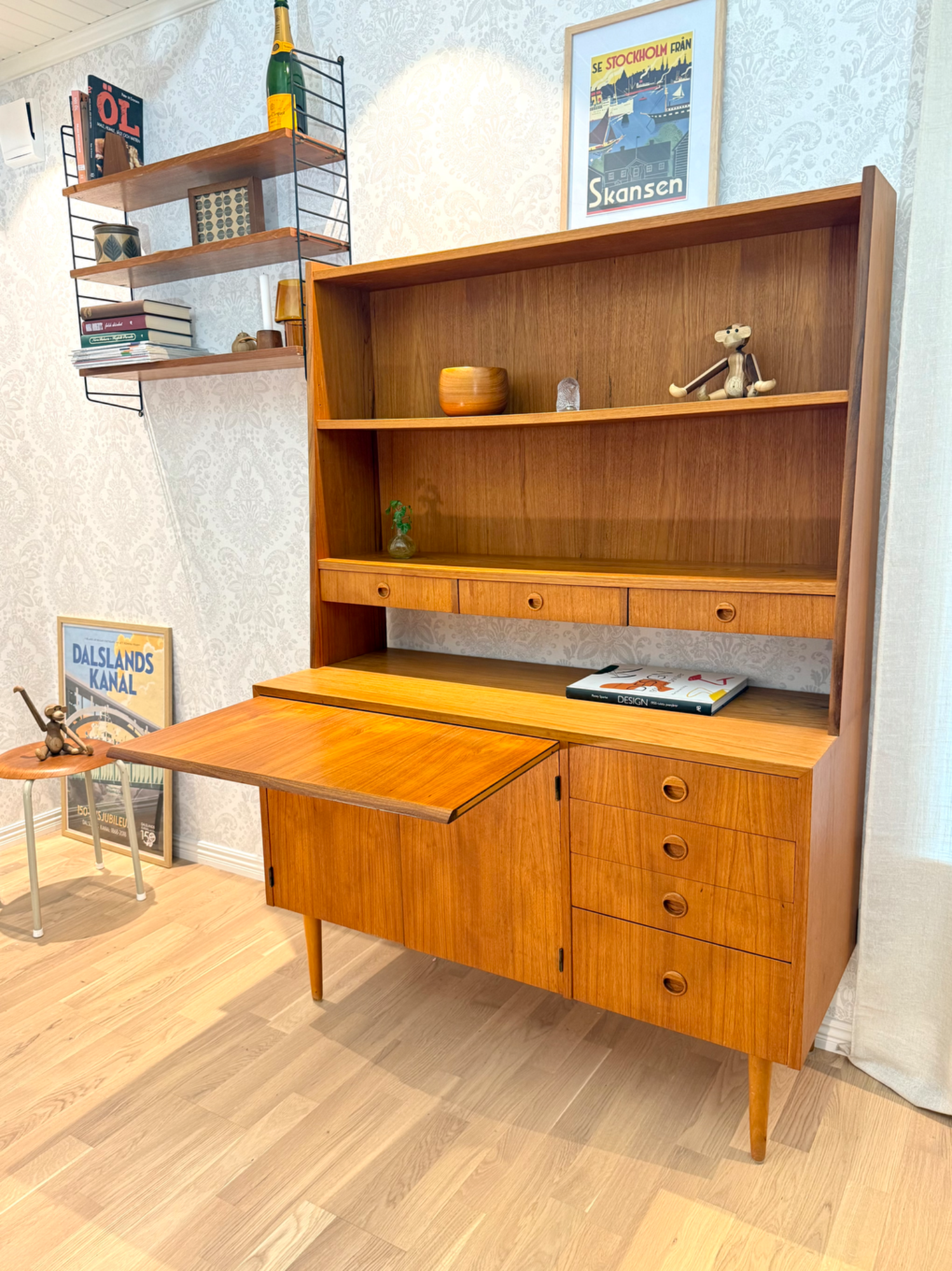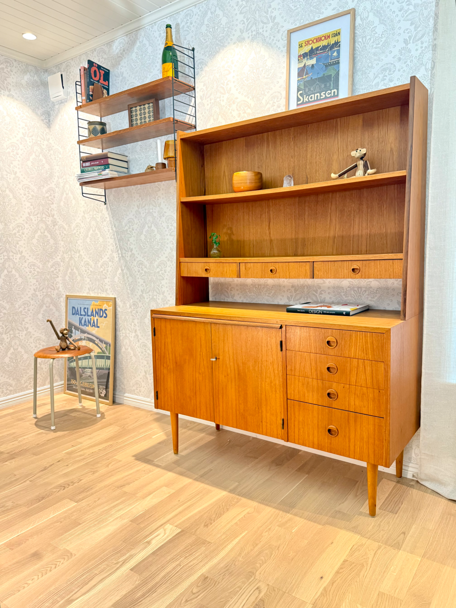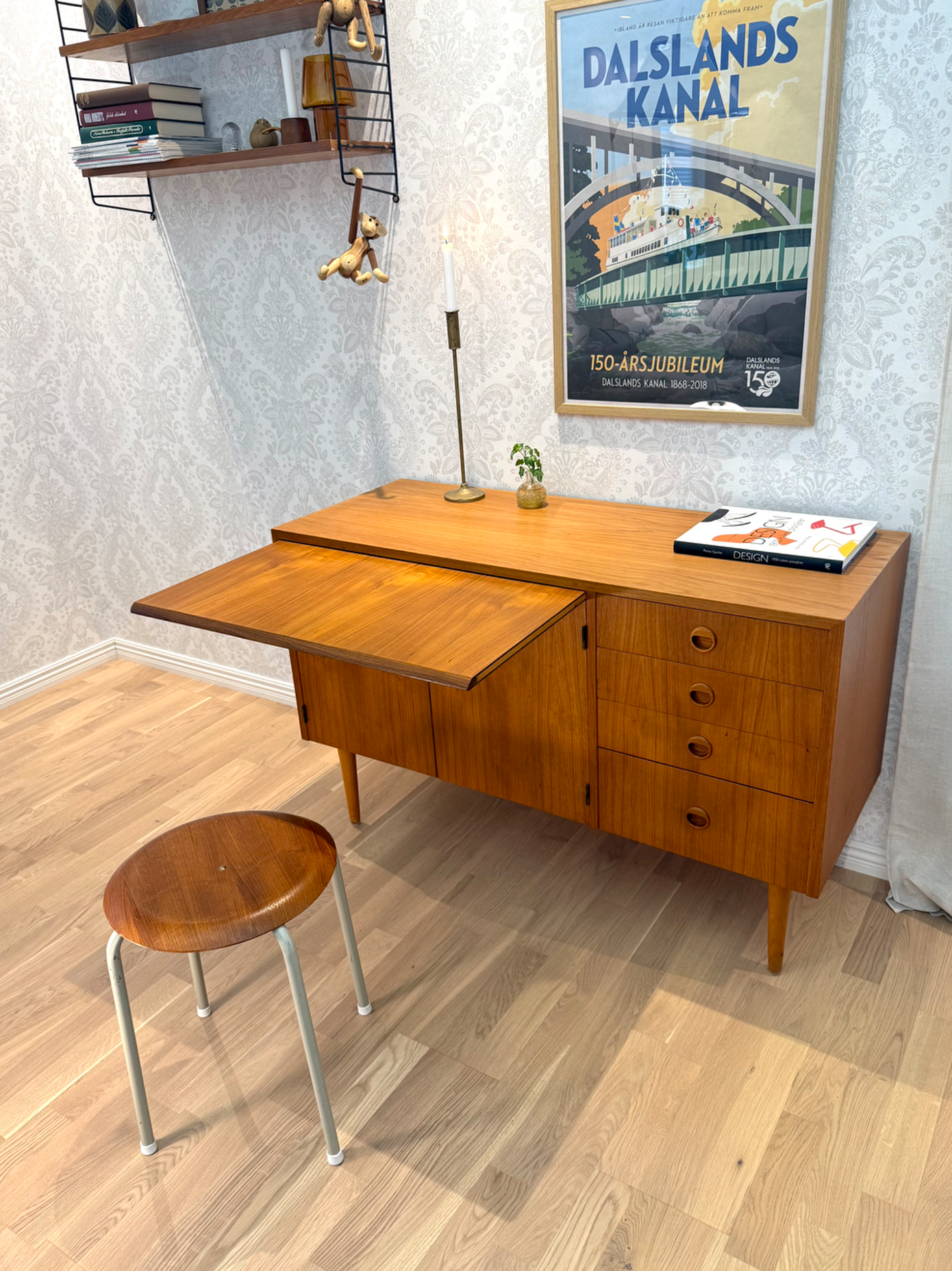 Perfekt skänk/ sidebord i teak för den som letar efter förvaring i både lådor samt hyllplan. Här finner vi en extra skiva som tex. kan användas som skrivbordsdel. Hylldelen är delbar önskar man enbart skänken går det enkelt att lösa.