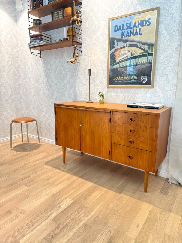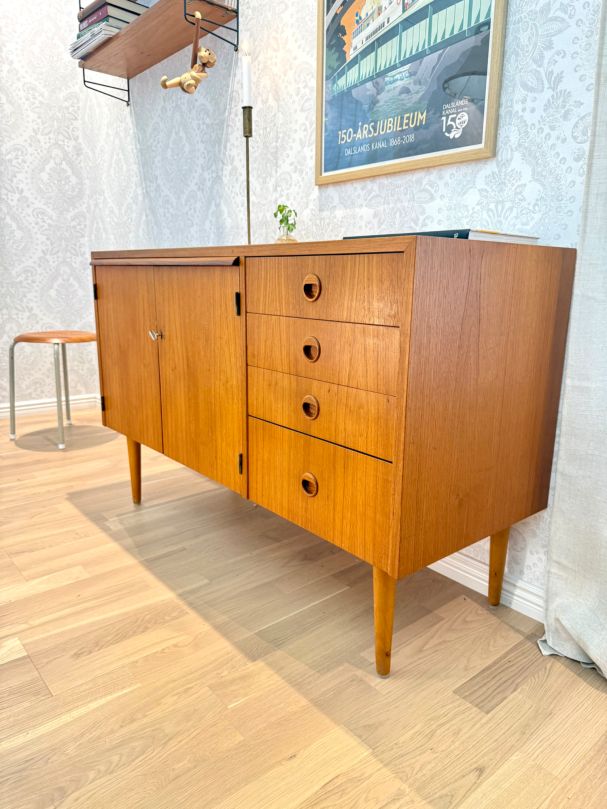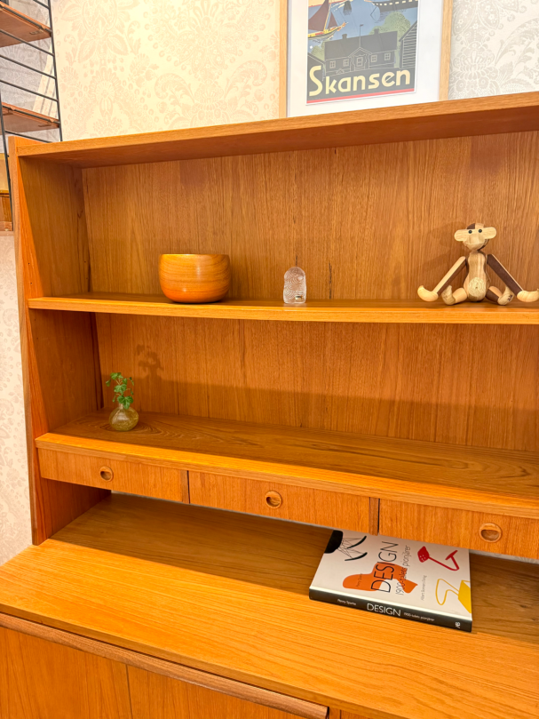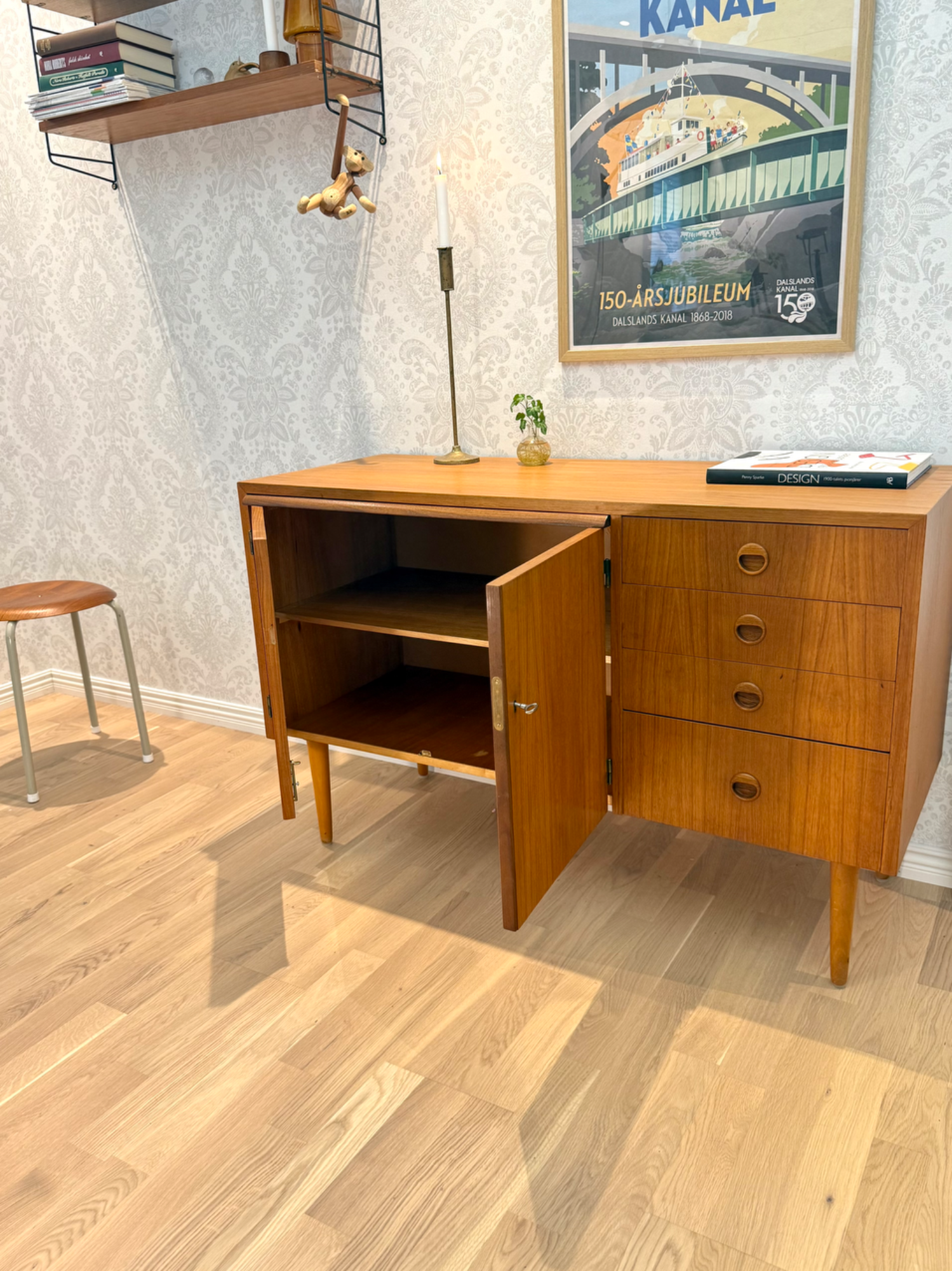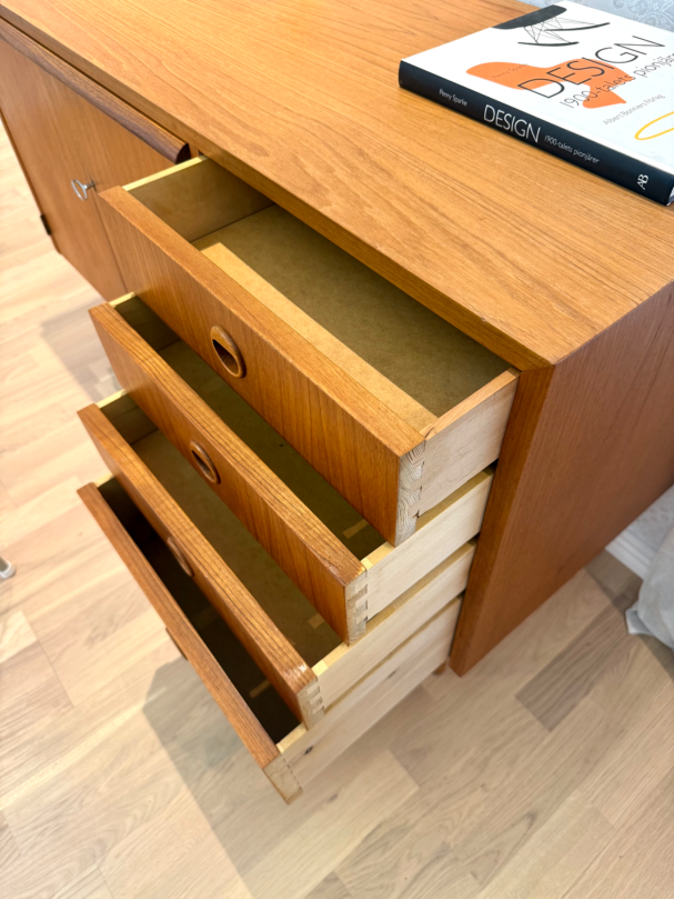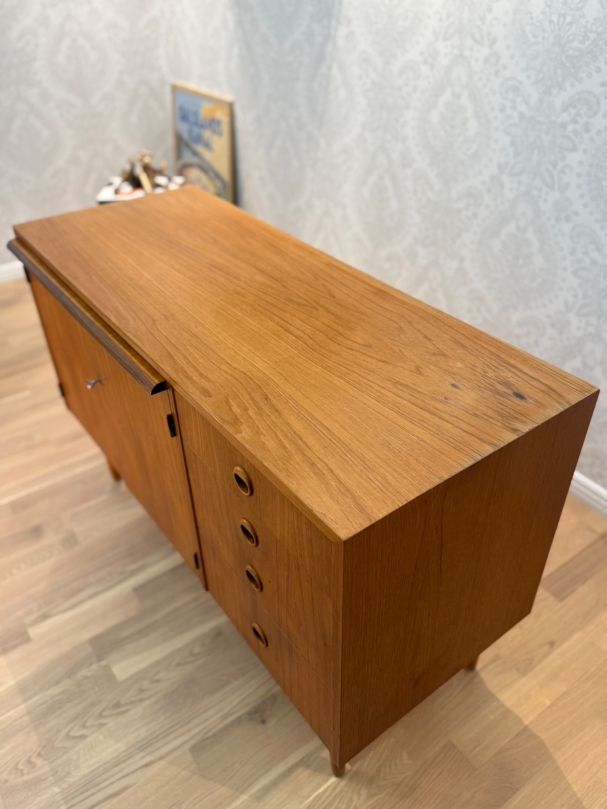Perfekt skänk/ sidebord i teak för den som letar efter förvaring i både lådor samt hyllplan. Här finner vi en extra skiva som tex. kan användas som skrivbordsdel. Hylldelen är delbar önskar man enbart skänken går det enkelt att lösa.
