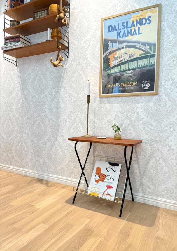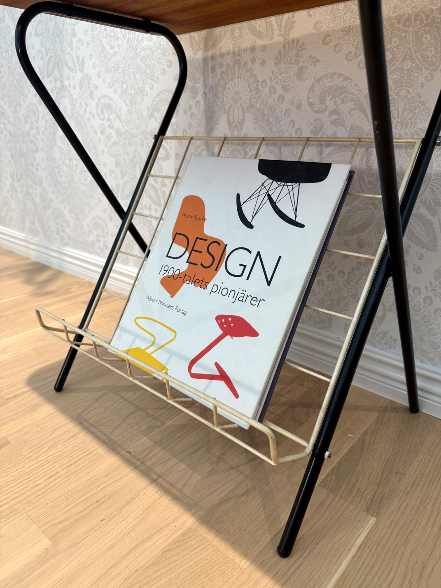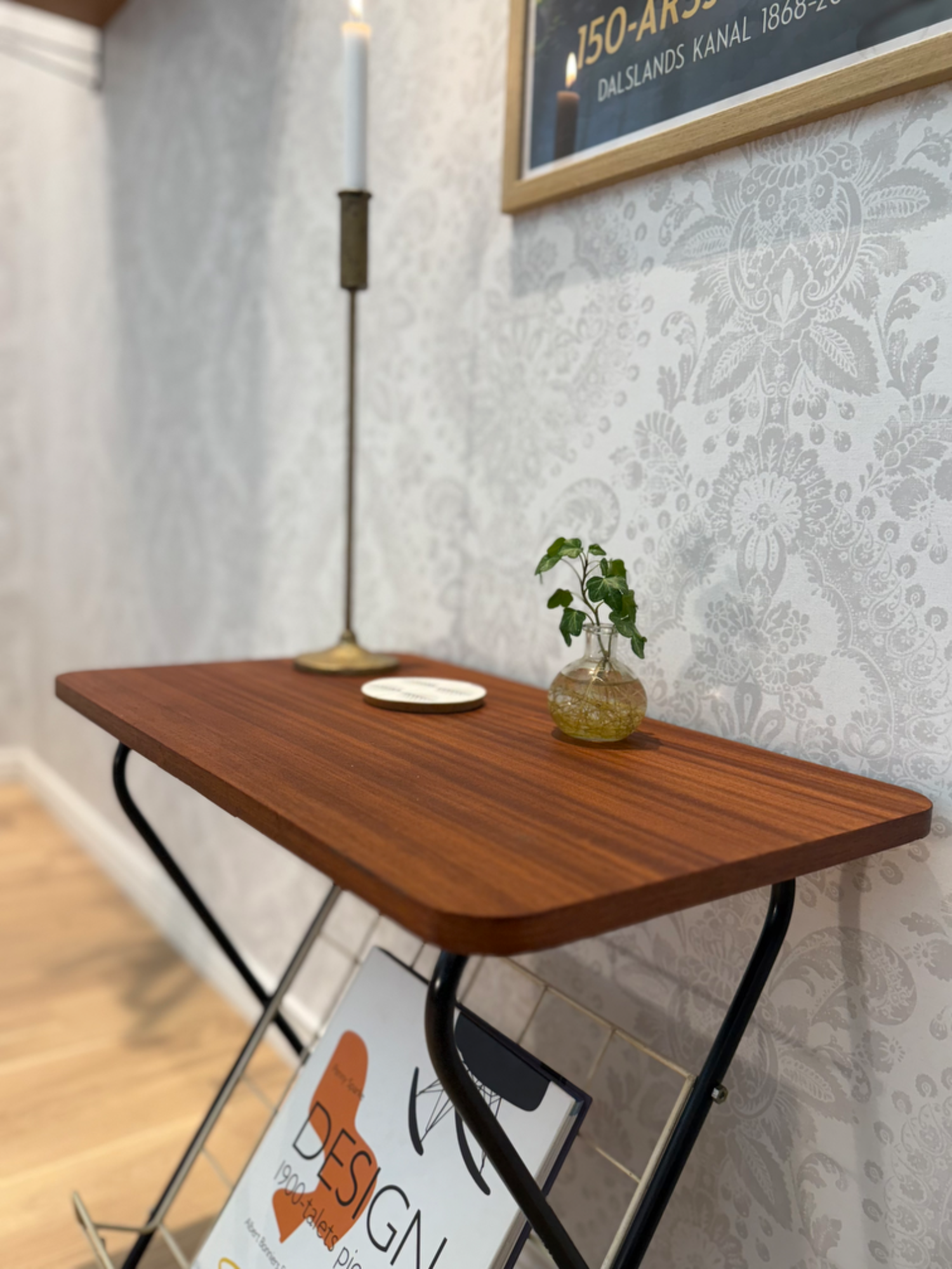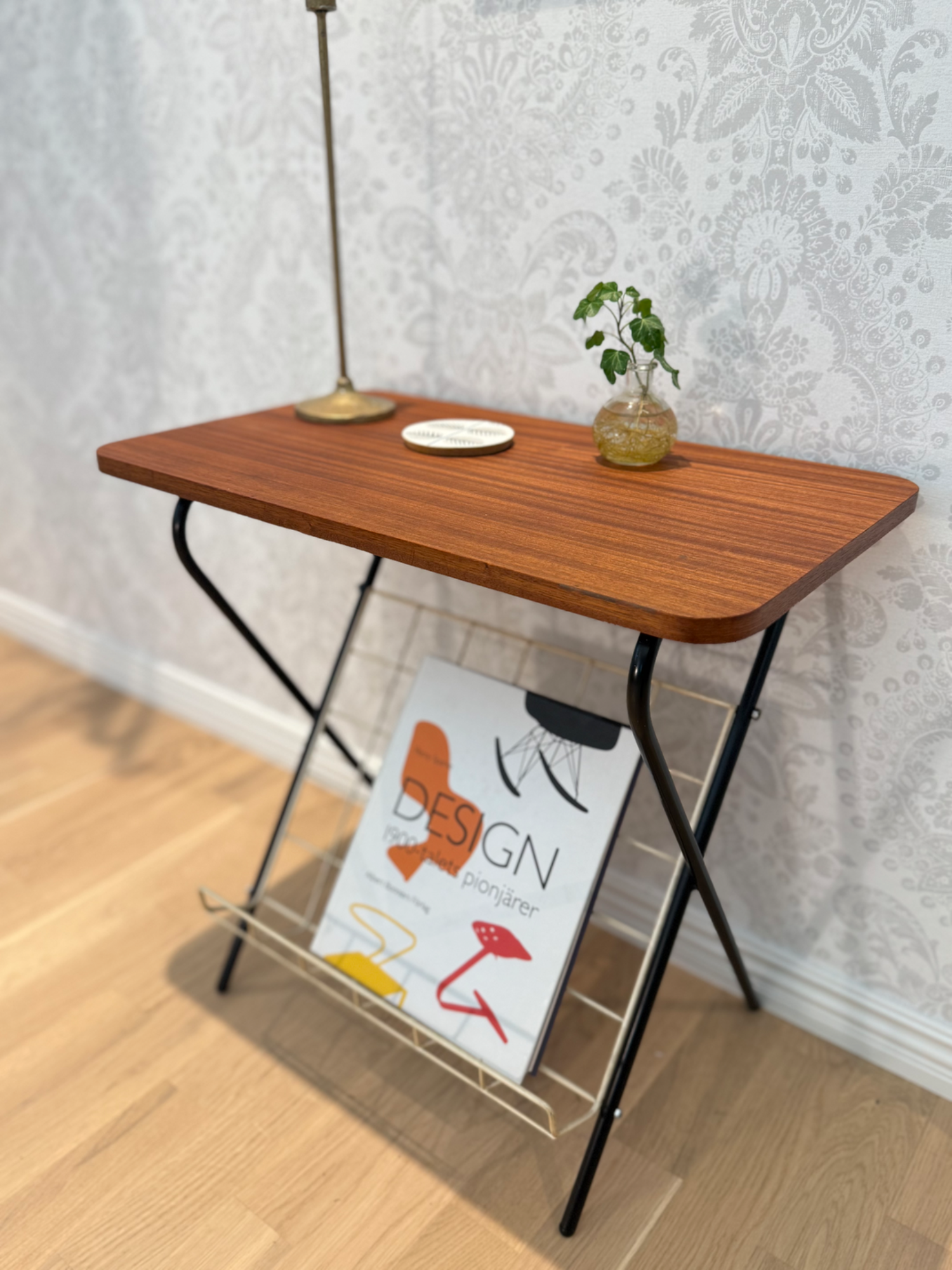 Stilrent teak stringbord med tidningställ, nätt och lättplacerat.