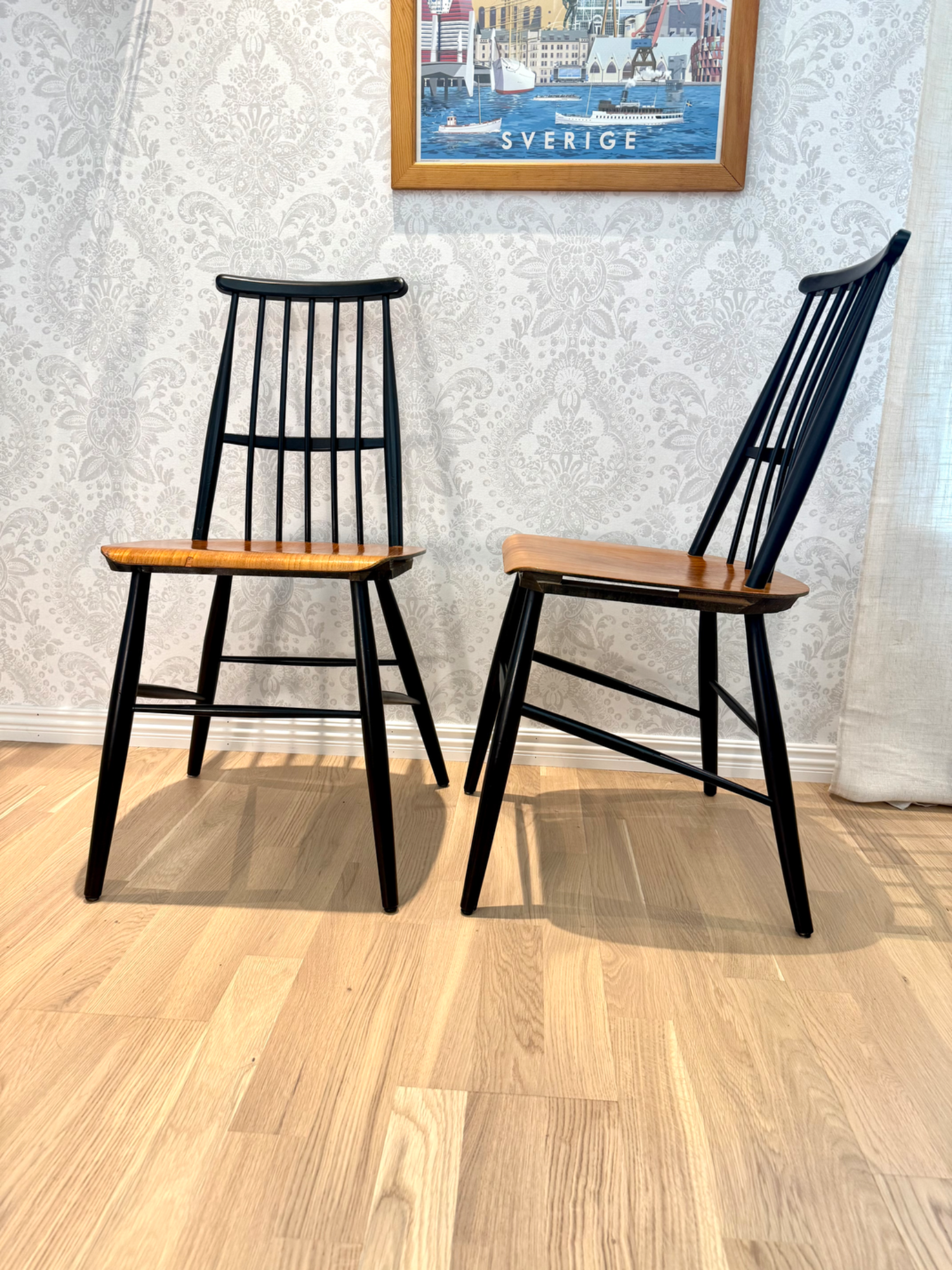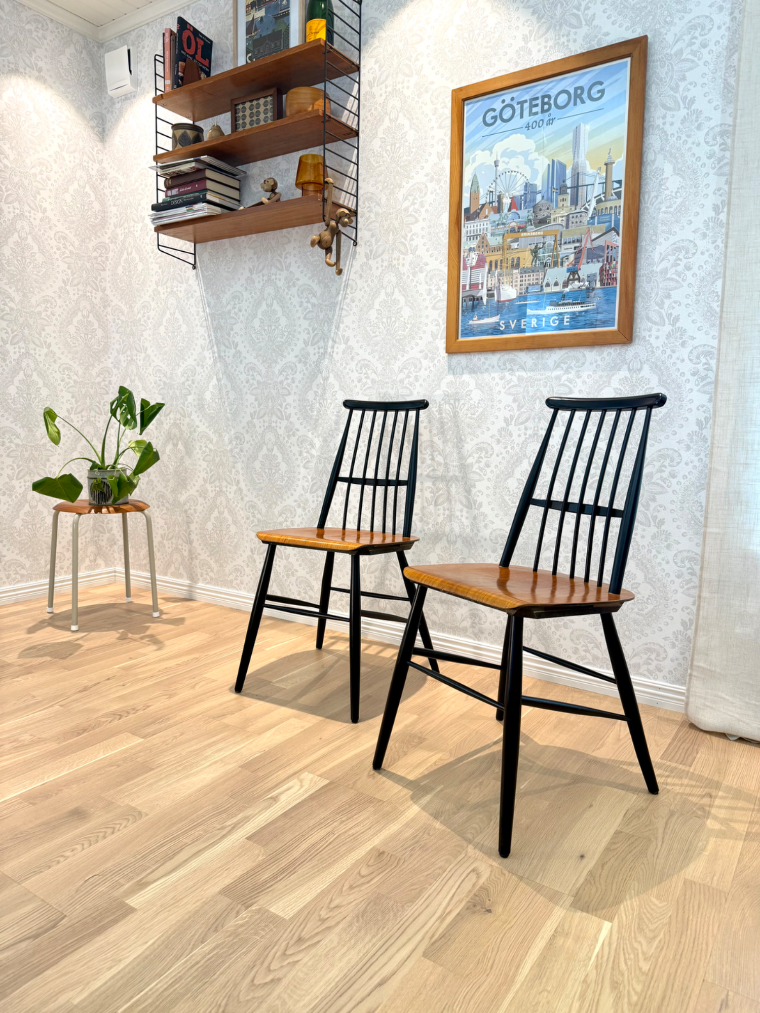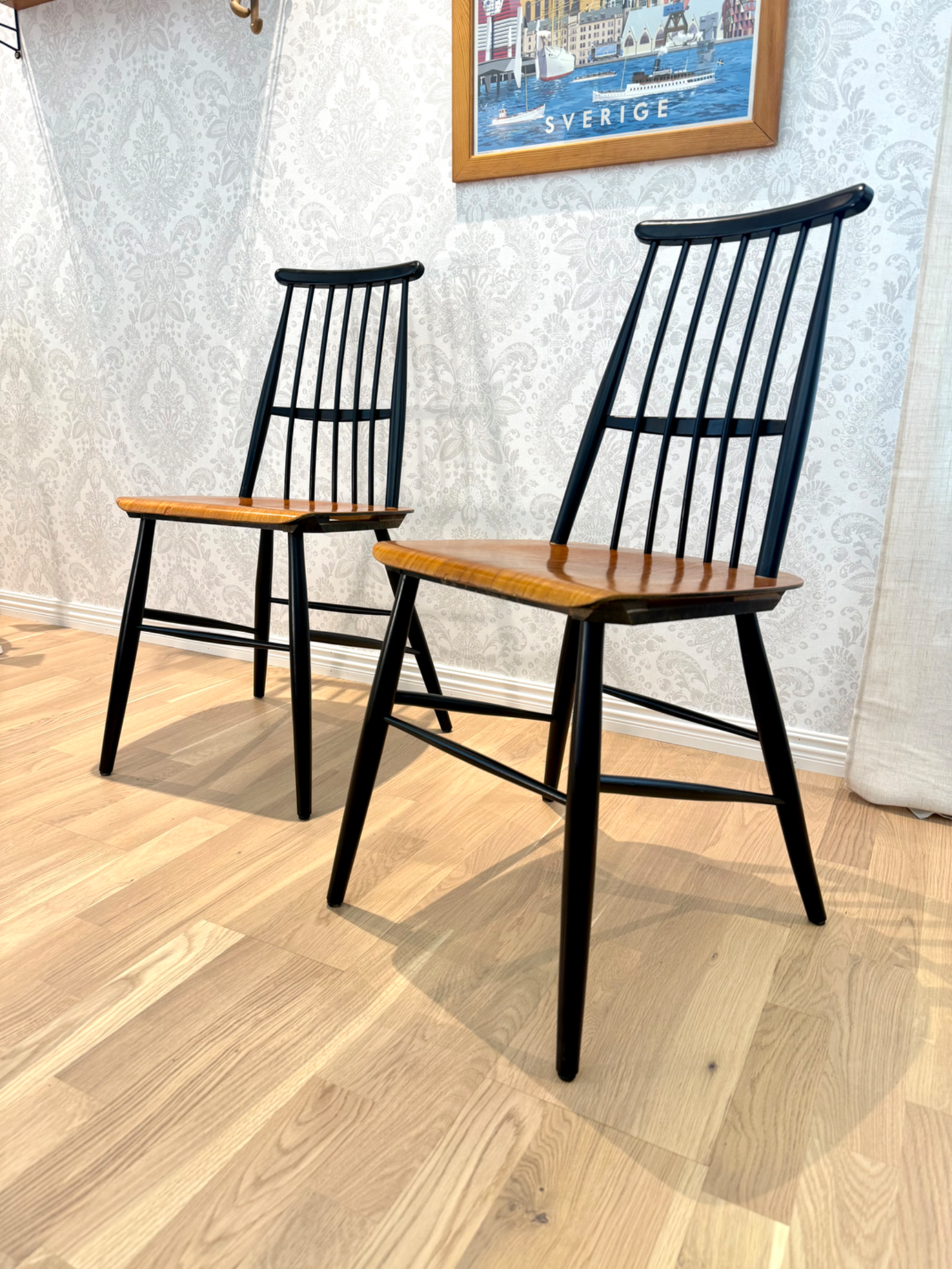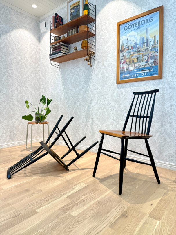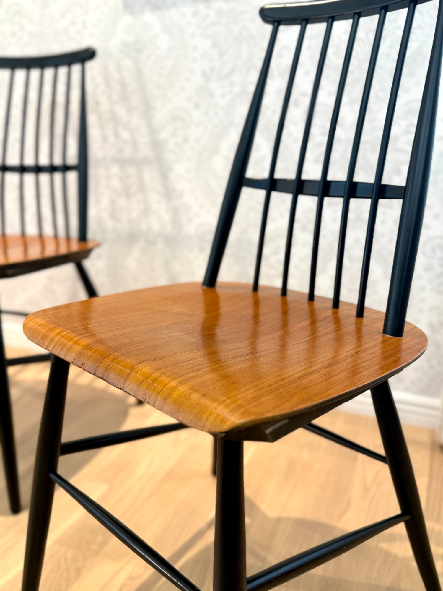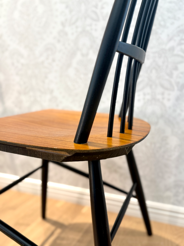 Stilrena pinnstolar i teak med svarta detaljer.