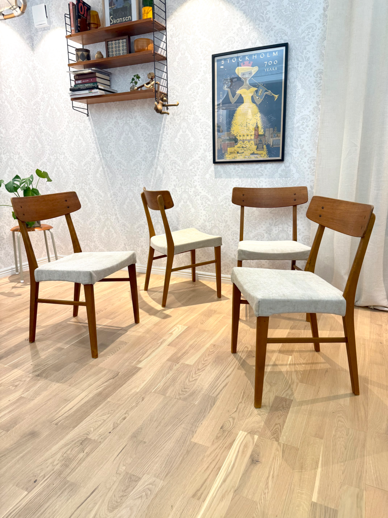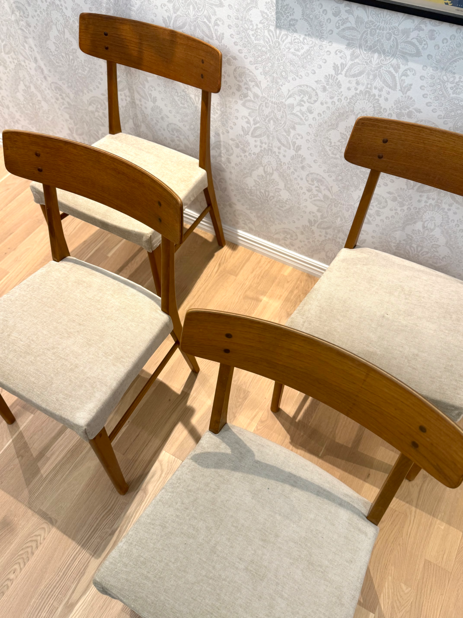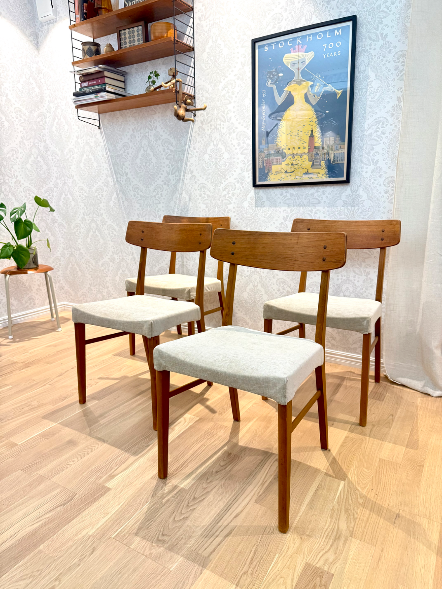 Fyra teak stolar med ljus klädsel, stabila, finns matbord att köpa till om man önskar.