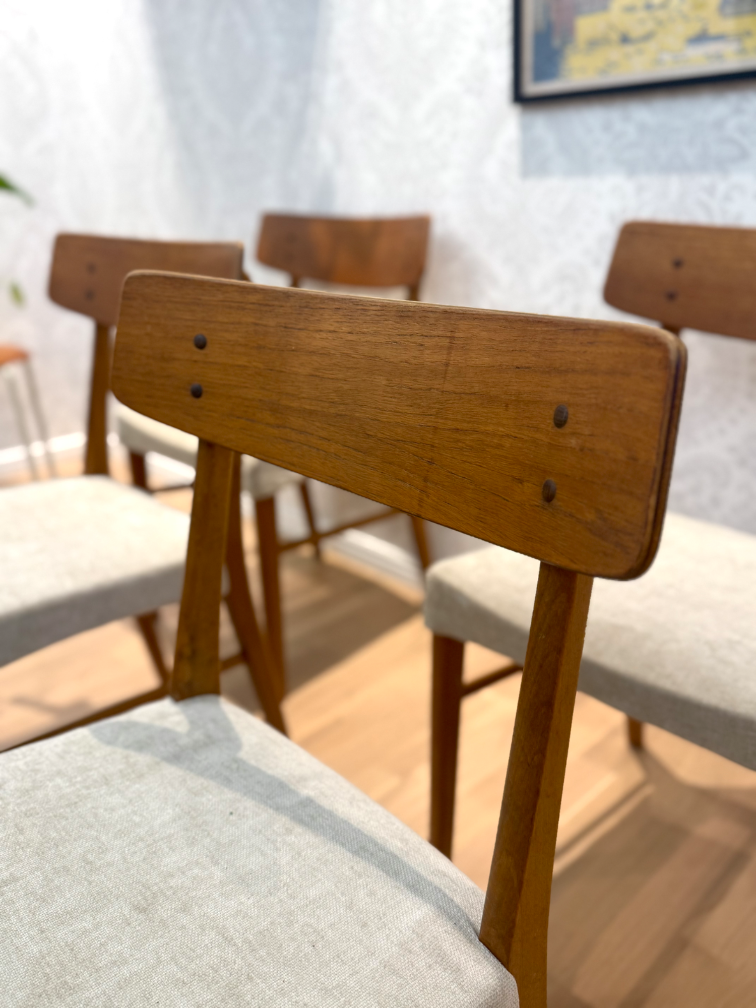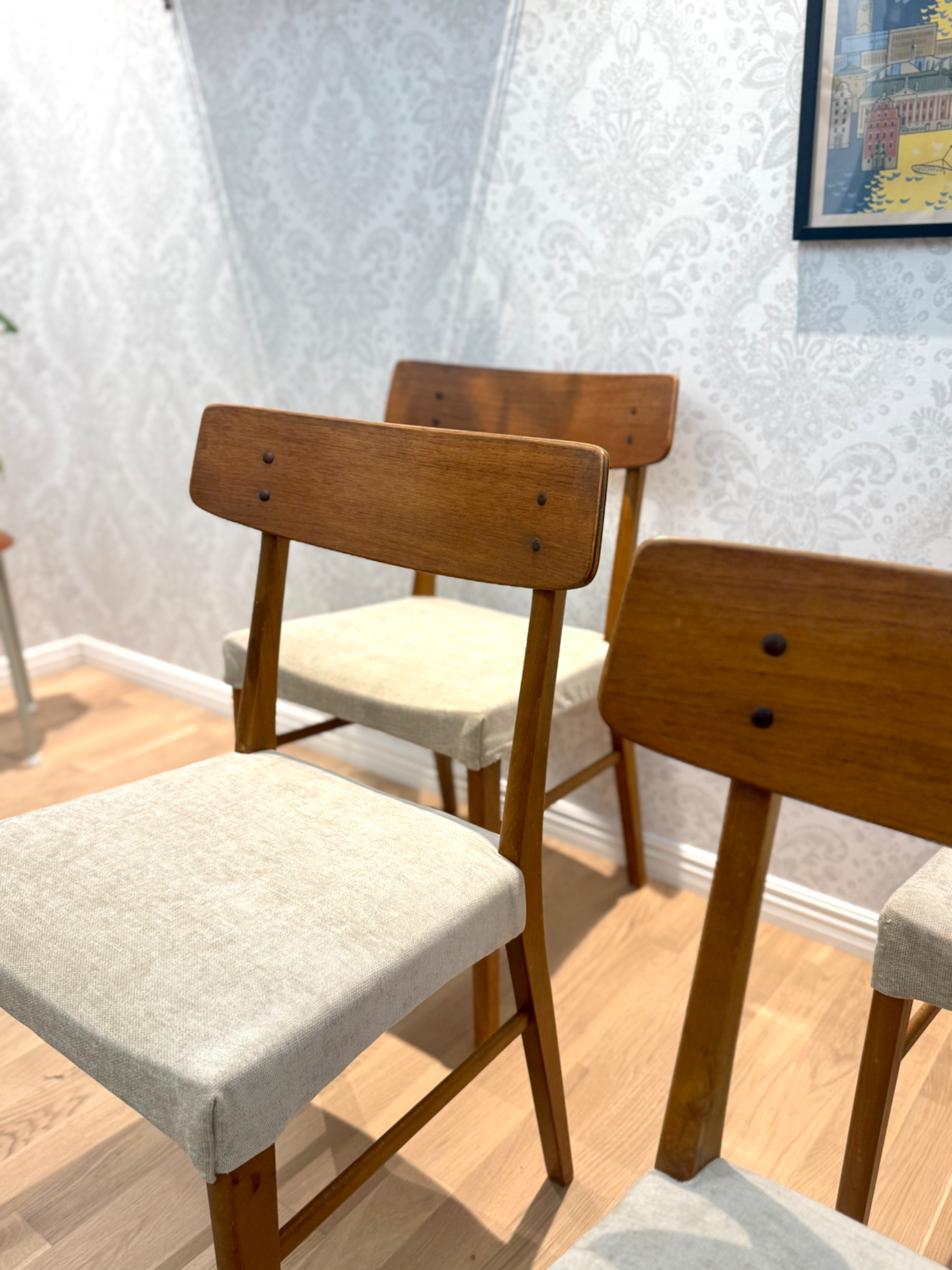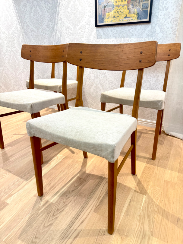 Fyra teak stolar med ljus klädsel, stabila, finns matbord att köpa till om man önskar.